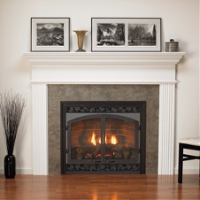 ![]() Profile Mantel shown with a White Mountain Hearth Deluxe 36 Direct-Vent Fireplace trimmed in Hammered Pewter Decorative Frame, and matte black doors and outer frame. | ![]() Profile Mantel shown in custom finish with White Mountain Hearth Deluxe 32 Direct-Vent Fireplace with Brass Decorative Louvers and outer Frame. |
