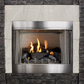 Carol Rose Coastal Collection 36-inch Outdoor Stainless Steel Traditional Premium Fireplace with 24-inch Outdoor Wildwood Refractory Log Set in a custom surround.